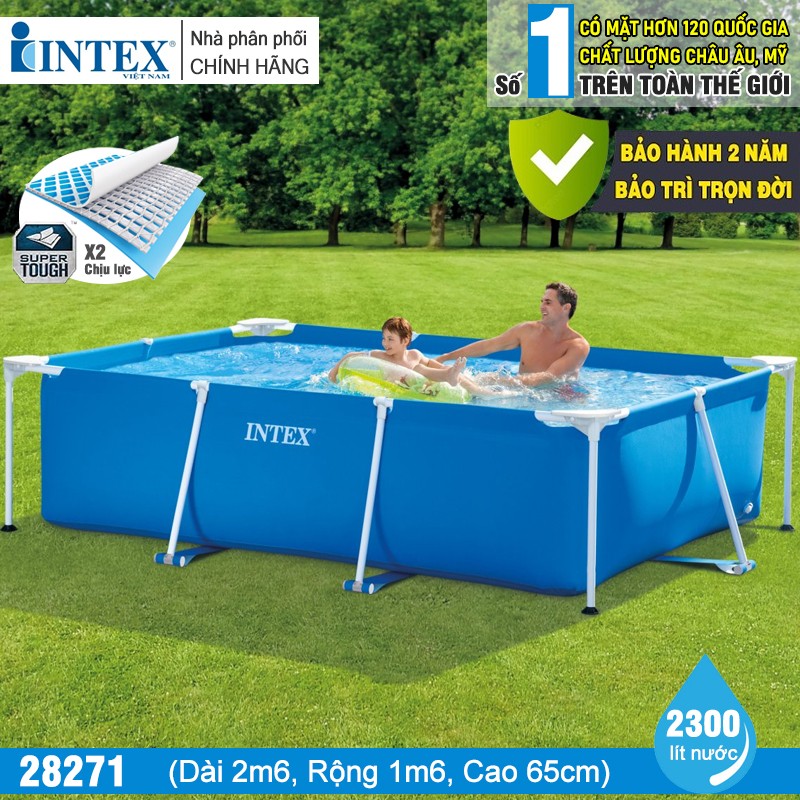 Bể bơi khung kim loại INTEX 28271 có thiết kế hình chữ nhật với kích thước chiều dài 2m6, chiều rộng 1m6 và chiều cao 65cm (Diện tích lắp đặt 300*200cm), dung tích nước 2282L(2,3 khối nước), rất rộng rãi và thoải mái cho các bé vui chơi, tập bơi tại nhà.