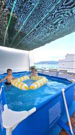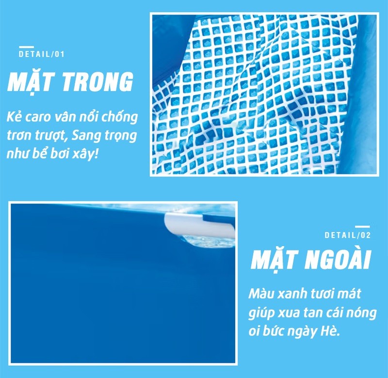 ✓ Trong lòng hồ bơi là kẻ caro xanh trắng như hồ bơi xây thật sang trọng và tạo cảm giác xanh mát