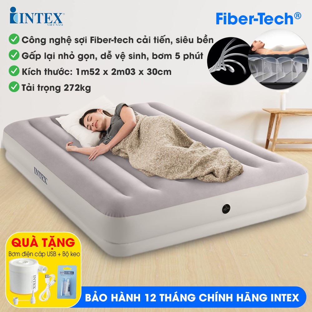 - Thương hiệu: INTEX - Kích thước giường sau bơm: Dài 2m03, rộng 1m52, cao 30cm - Chất liệu cao su non, phủ nhung bề mặt tạo độ thoáng khí, mát mẻ về mùa Hè, ấm áp về mùa Đông - TẶNG BƠM ĐIỆN sử dụng cáp USB sử dụng rất tiện, bạn chỉ cần cắm qua củ sạc ĐT hoặc cục sạc dự phòng nên rất tiện cho việc mang đi du lịch, dã ngoại ngoài trời.... - Thời gian bơm hơi 5 phút - Giường hơi INTEX 64179 sử dụng công nghệ mới FIBER-TECH siêu dai, tăng độ bền cho sản phẩm và tạo độ êm ái, thoái mái cho người sử dụng - Tải trọng của giường tới 272kg - Kích thước hộp đóng gói: , Cân nặng: - Sản phẩm bảo hành 1 năm, bảo trì vĩnh viễn, có dán tem đảm bảo chính hãng và phiếu bảo hành của Công ty TNHH sản phẩm bơm hơi INTEX Việt Nam. - Nguồn điện: USB 5V có công suất định mức 2A trở lên như bộ sạc điện thoại thông minh, bộ sạc ô tô USB 12V hoặc bộ sạc dự phòng di động