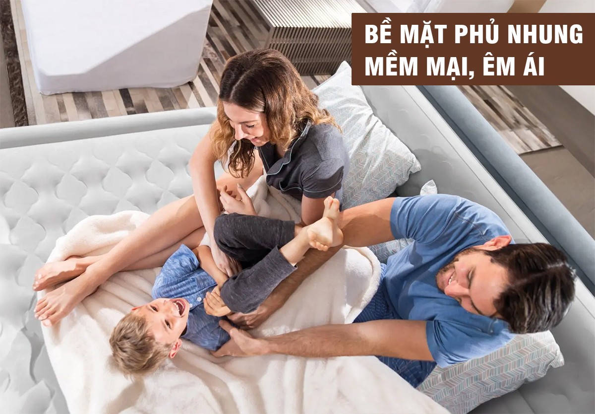 - Có thành giường sang trọng, tiện dụng - Công nghệ mới Fiber-tech cải tiến giúp tăng độ bền cho sản phẩm so với công nghệ thường - Phủ nhung bề mặt êm ái, không bị bí, dễ vệ sinh, dùng được 4 mùa - Bơm lên, gấp gọn chỉ mất 5 phút |