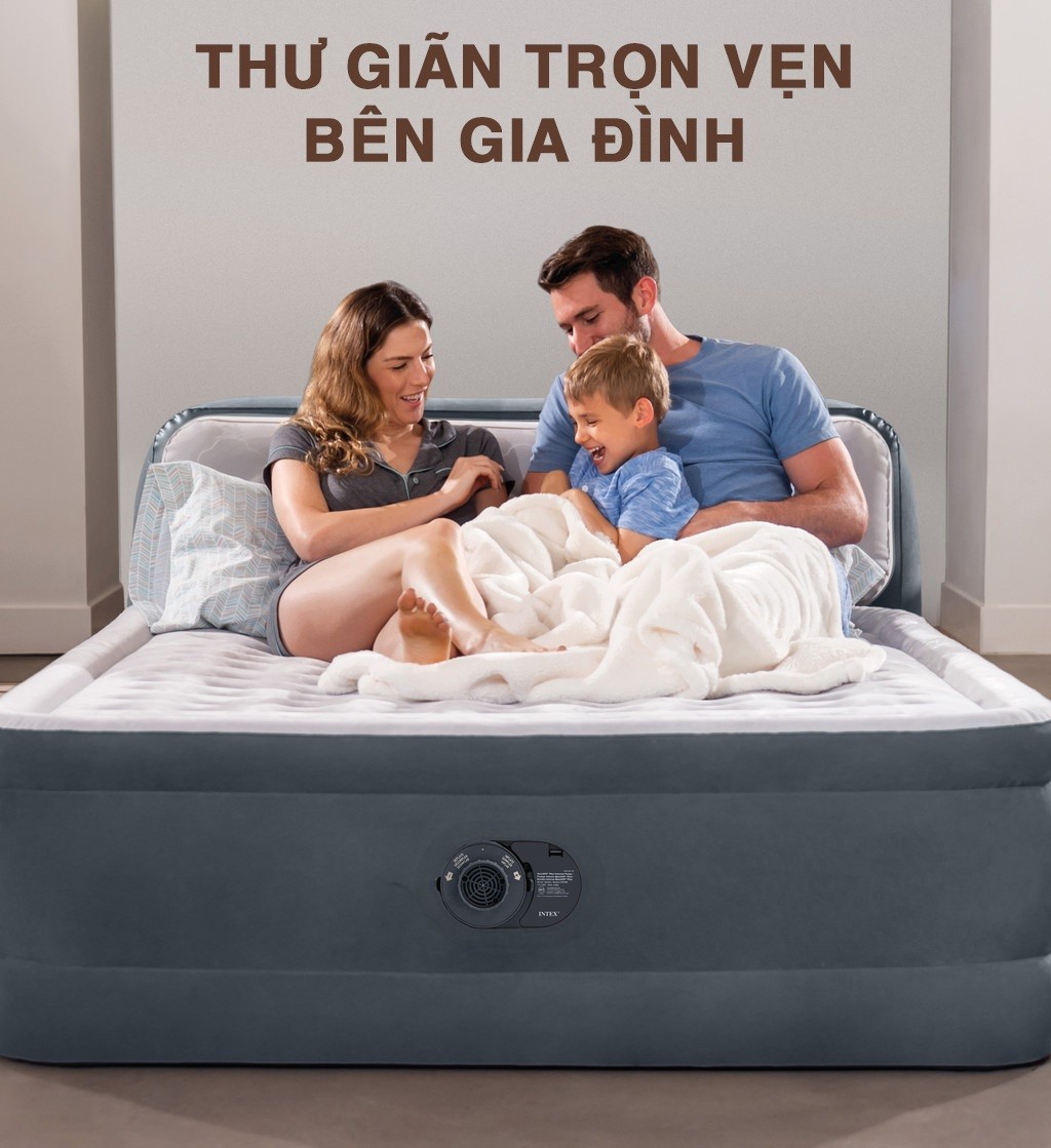 - Hãng sản xuất: INTEX - Kích thước giường sau bơm: Dài 236cm, rộng 152cm, thành cao 86cm (giường cao 46cm) - Tích hợp sẵn bơm điện 220V hút xả 2 chiều siêu tiện lợi, dễ sử dụng - Thời gian bơm hơi chỉ 5 phút (căn thời gian để ngắn công tác) - Chất liệu cao su non, phủ nhung bề mặt êm ái, không bị bí, Đông ấm - Hè mát - Tích hợp thành giường sang trọng, tựa vào siêu êm và thư giãn - Giường hơi INTEX được sử dụng công nghệ Fiber-tech tiên tiến siêu bền - Khi nằm lên sẽ không bị võng lưng mà cực kỳ nhẹ nhàng, êm ái, thoải mái cực kỳ - Sử dụng được trong nhà và ngoài trời với chất liệu không thấm nước, dễ vệ sinh - Chiếc giường hơi dự phòng khi nhà có khách, xách về quê mỗi lần về chơi không lo chỗ ngủ - Bảo hành 12 tháng toàn quốc có phiếu bảo hành và tem đảm bảo kèm theo