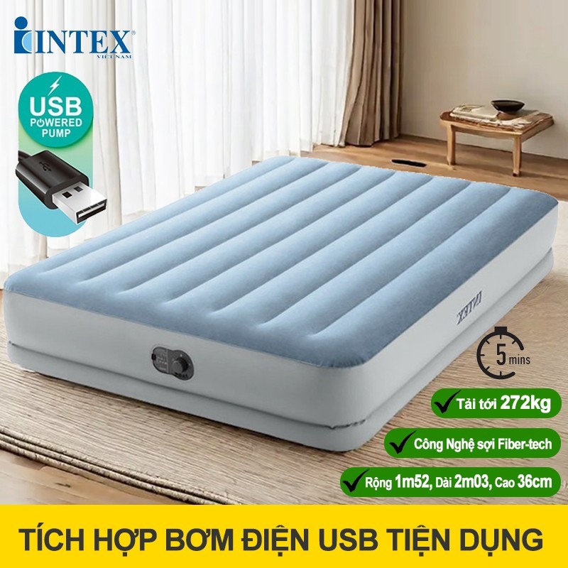 Một trong những mẫu nổi bật hiện nay là Giường hơi đôi Intex 1m52 cao cấp tích hợp bơm điện cổng USB – 64159. Đây là lựa chọn lý tưởng cho gia đình trẻ, người thường xuyên di chuyển hoặc những ai muốn tối ưu không gian sống.